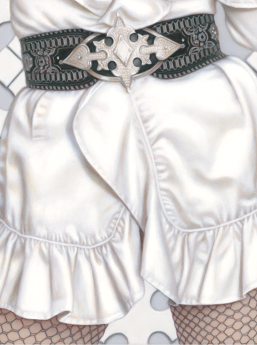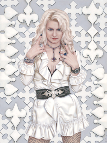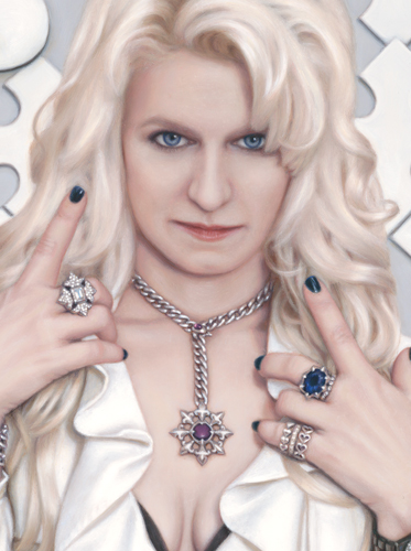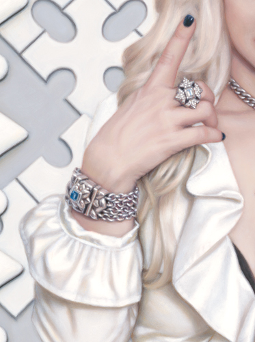 Margo is one of New York City's most talented jewelry designers. Her distinctive style, blonde hair, satin dress, and dramatic eyes inspired me to create a white-on-white world where she is surrounded by the motifs that she has used in her jewelry, she is living in a world of her own designs.
